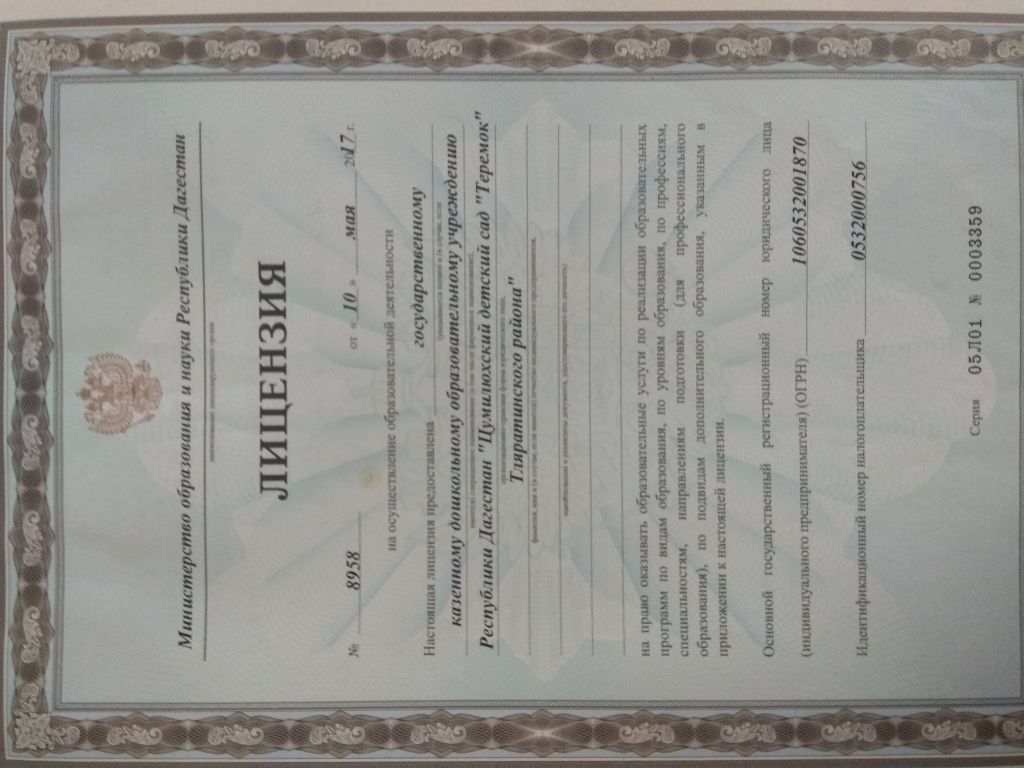 | Полное наименование образовательной организации* | Государственное казенное дошкольное образовательное учреждение Республики Дагестан «Цумилюхский детский сад «Теремок» Тляратинского района». |